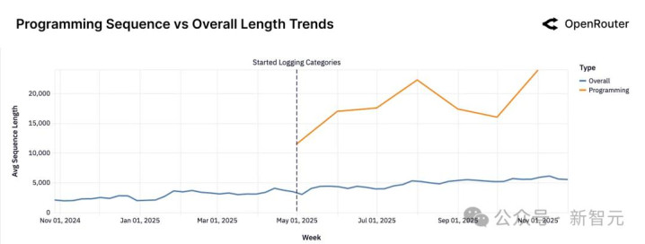 其中,编程中的序列长度与整体对比。编程提示词的系统性更长且增长更快。