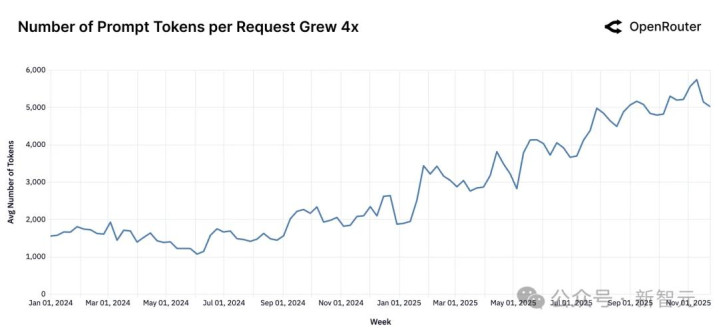 提示词数量呈上升趋势。自2024年初以来,平均提示词长度已增长近四倍,反映出工作负载对上下文依赖度的显著提升。