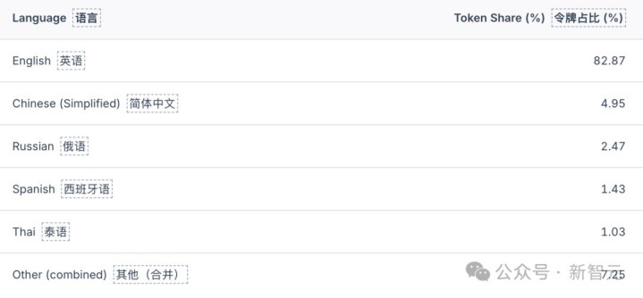 但简体中文以近5%的份额位居第二,不仅超过了西班牙语和俄语,也侧面印证了中文AI社区的活力。