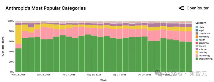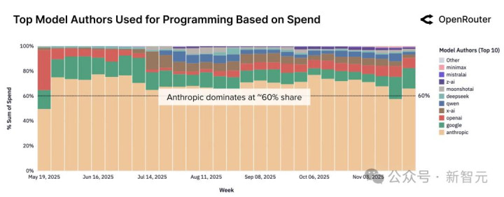 编程工作负载高度集中:Anthropic的模型处理最大比例的代码查询,其次是OpenAI和Google,MiniMax所占份额正在增长。