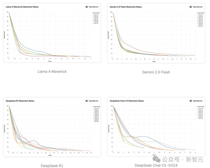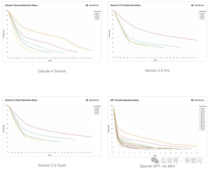 赢家:GPT-4o Mini、Claude 4 Sonnet和Gemini 2.5 Pro在发布初期都形成了明显的基石群组,留存率曲线在高位企稳。