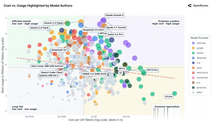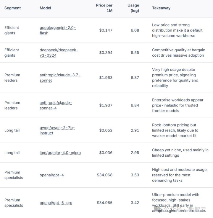 高级领导者(Premium leaders):成本不低,但使用量仍然很高,比如Claude Sonnet 4、Gemini 2.5 Pro等。