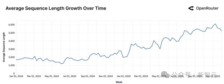 上图显示,过去20个月中平均序列长度增长超过三倍,从2023年末的不足2000个标记增至2025年末的5400个以上。