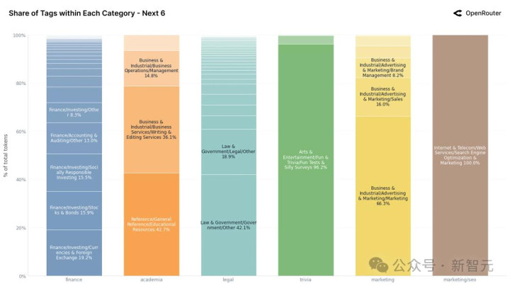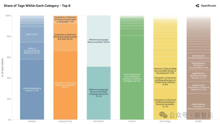 按总Token份额排名的前6大类别。每个条形图显示该类别内主要子标签的细分。
