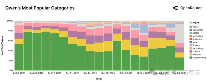 Qwen:在编程任务上表现出高度集中,角色扮演和科学类别的使用随时间波动。